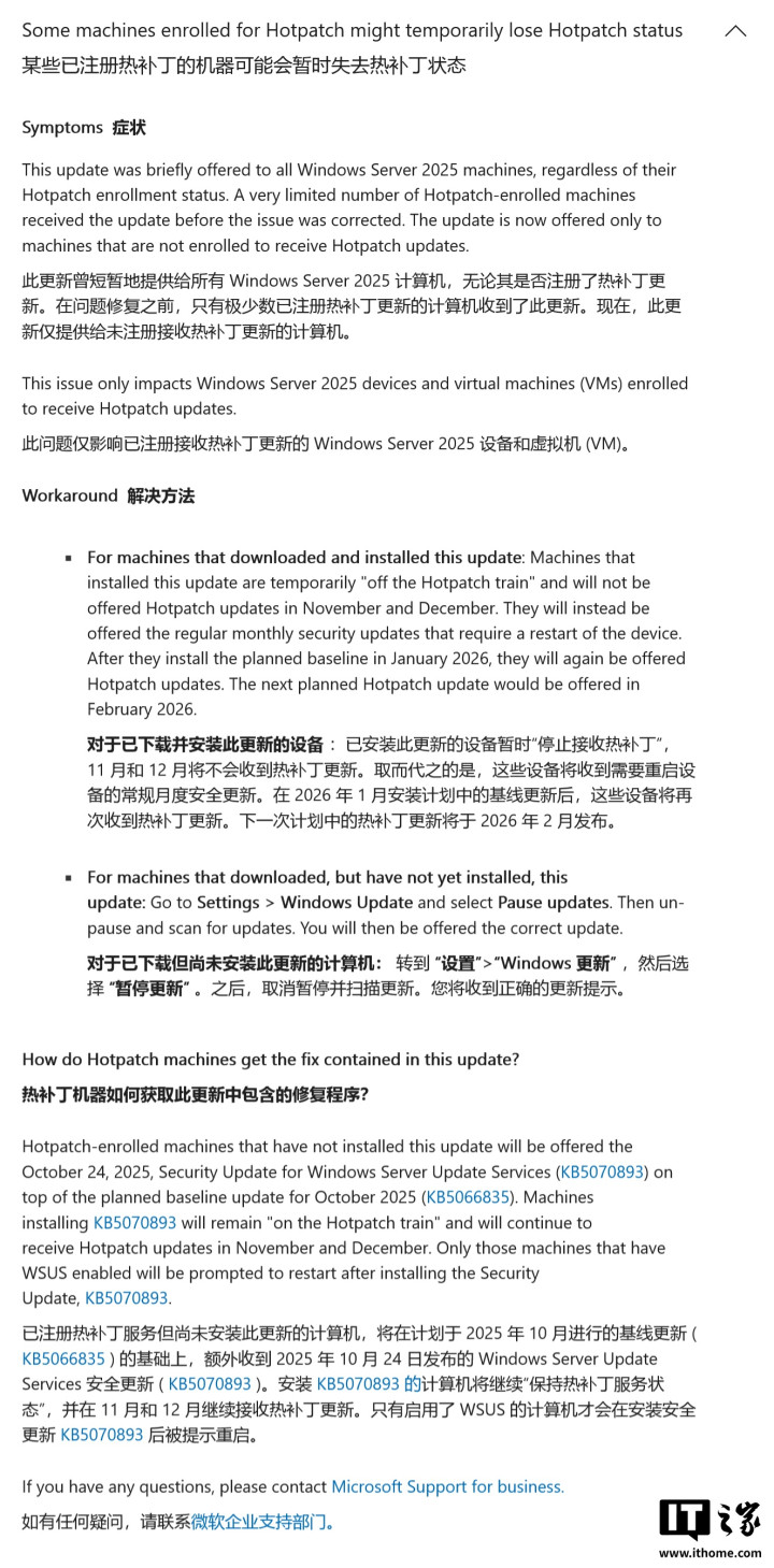 已经安装了错误更新的设备将暂时脱离热补丁更新序列,无法在11月和12月接收免重启更新,而是需要安装常规的月度安全更新,这意味着服务器必须重启。对于已下载但未安装的用户,微软建议先暂停更新,然后重新扫描以获取正确的修复补丁KB5070893。