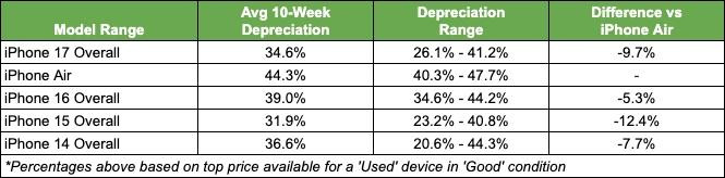 内容亮点:Air 系列贬值率远高于 iPhone 17,受销量疲软与维修成本影响。